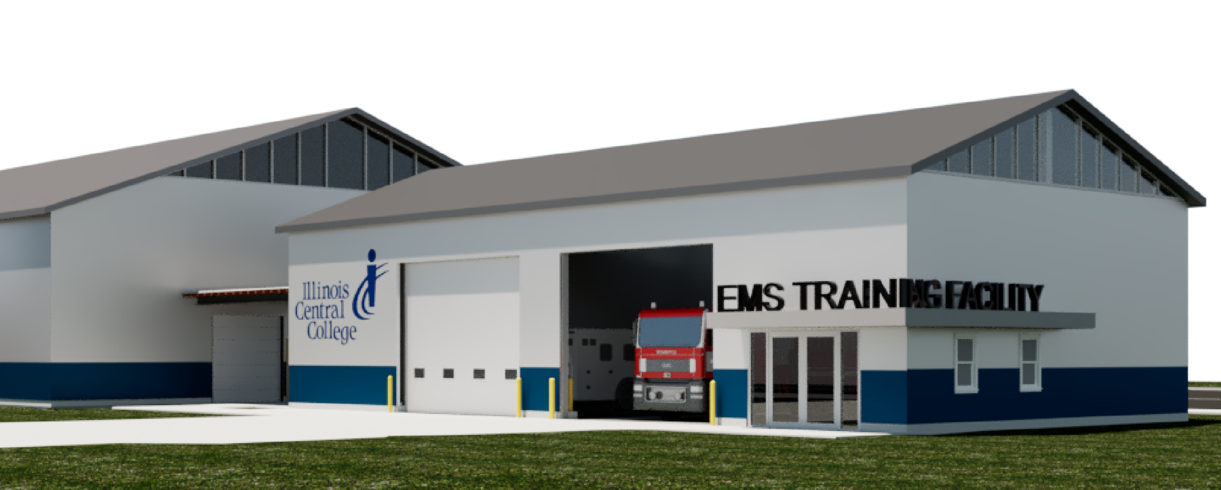 Pekin Campus: A new 40’ x 60’ x 16’ pre-engineered metal building to serve as a EMT vehicle storage along with a exterior corridor link with a canopy cover was designed as an addition to the existing Pekin Facility. The new addition was designed to have heating only to keep the vehicles from freezing during winter break when campus is inactive. New paved access drive from Hannah Drive to the new addition was also provided in the design scope. A new detention area with associated drainage structure was provided to the east of the campus site. Similar to East Peoria, there was a major emphasis on the aesthetic of the vehicle storage as that was to set the influence of the existing Pekin campus building façade replacement, which was also completed by HOH in a separate design contract.